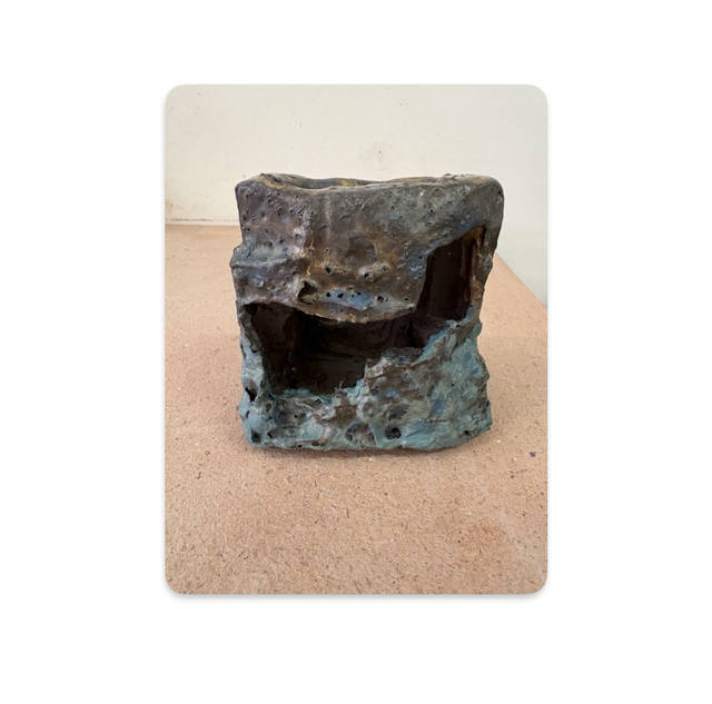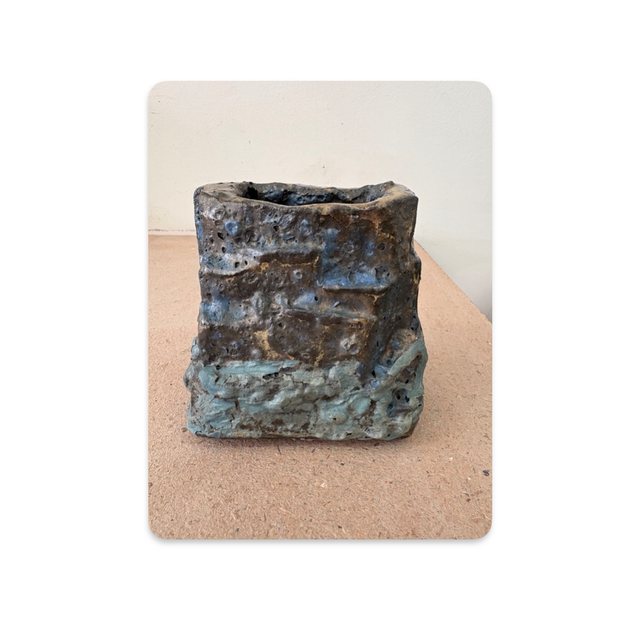 Coarse black stoneware meets a thickly layered combination of blue glazes in stunning and subtle colour hues for this abstract landscape piece.