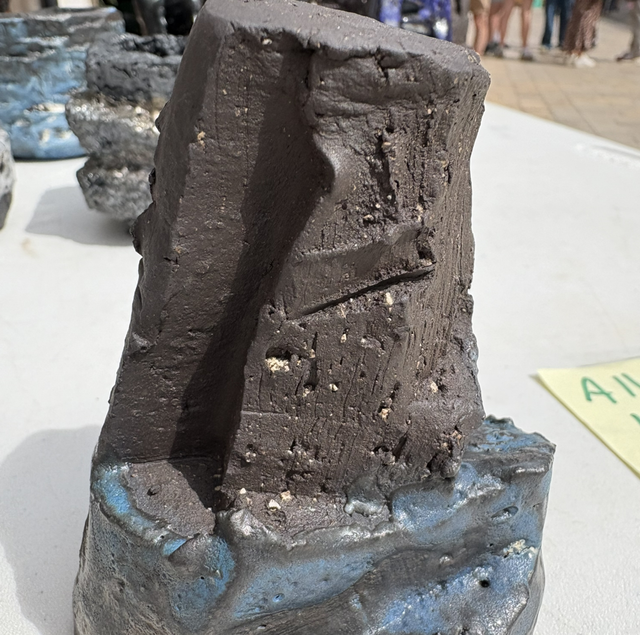 Abstract small sculpture in black clay with a blue glaze. Designed to symbolise an ocean folly.